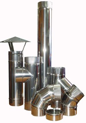 Элементы дымохода выполнены из жаростойкой нержавеющей стали марки AISI 430 (08Х10Т) с зеркальной поверхностью толщиной 0,5 мм и 0,8 мм (а также из оцинкованной стали толщиной 0,5мм).