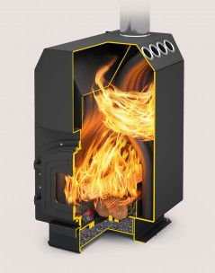Продолжительность горения печей линейки «ТОП-модель» на одной закладке дров - до 8 часов, что достигается конструктивными особенностями: герметичными дверцами, многооборотной топкой и дозированной подачей вторичного воздуха для дожигания газов.