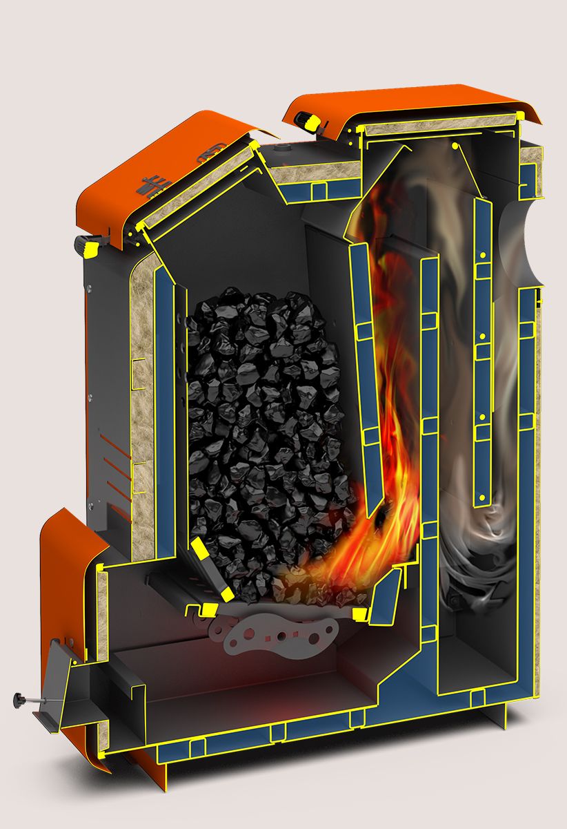 Элементы дымохода, регулятор тяги, блок ТЭН и пульт управления к нему не входят в комплект котла и при необходимости приобретаются отдельно (вкладка Комплектующие). Конструкция котла «Куппер МЕГА» предусматривает возможность их установки.Удобная загрузка топлива