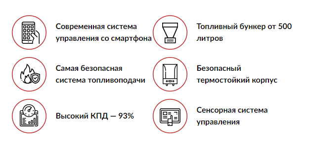 - Горелки, эффективно сжигающей топливо, за счет применения эффективных алгоритмов подачи топлива и воздуха, регулирующих процесс горения, а также конструктивных особенностей горелок на гранулах.